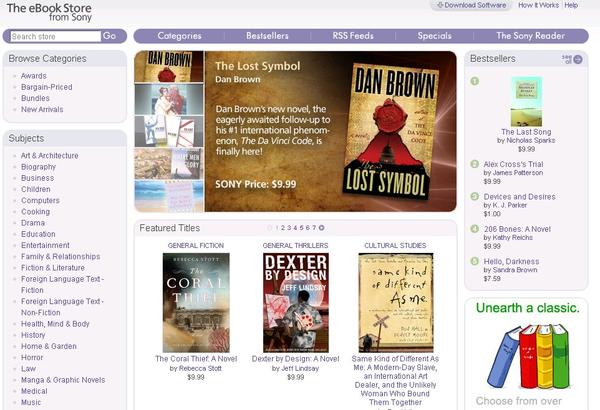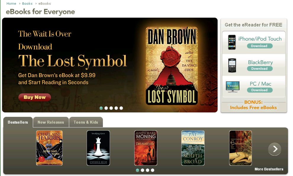 Son service compte un peu moins d’ebooks que celui d’Amazon, 200 000 ebooks, mais propose aussi les derniers best sellers (Lost Symbol de Dan Brown est aussi ici présent)